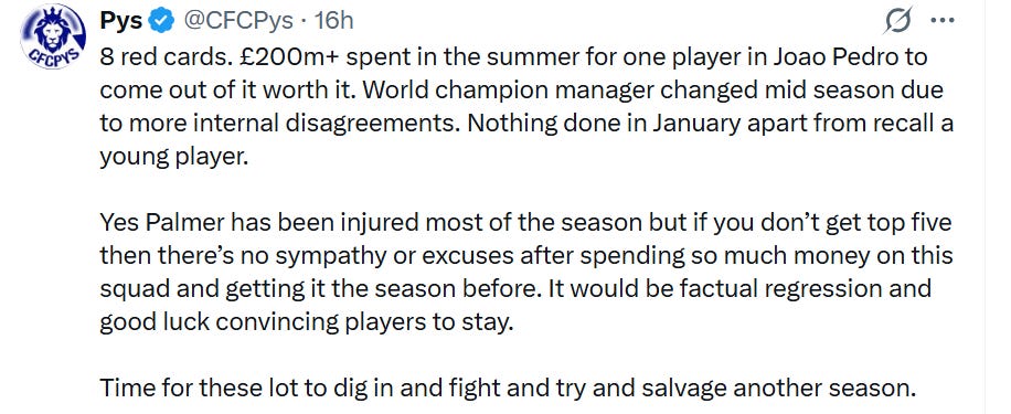 He’s had players like Joao Pedro playing the best football of his life, he’s been mostly using full backs as full backs. And other than against Burnley, I’ve seen some decent flexibility, pragmatism, and dynamism from him. He’s made our midfield more stable with the use of Andrey Santos in there, and players like Enzo Fernandez and Cole Palmer have also stepped up their form under Rosenior too, albeit Palmer failed to turn up on Saturday, unfortunately. But overall, they all seem to be enjoying the setup much more. This has all been enough to give me a lot of encouragement.